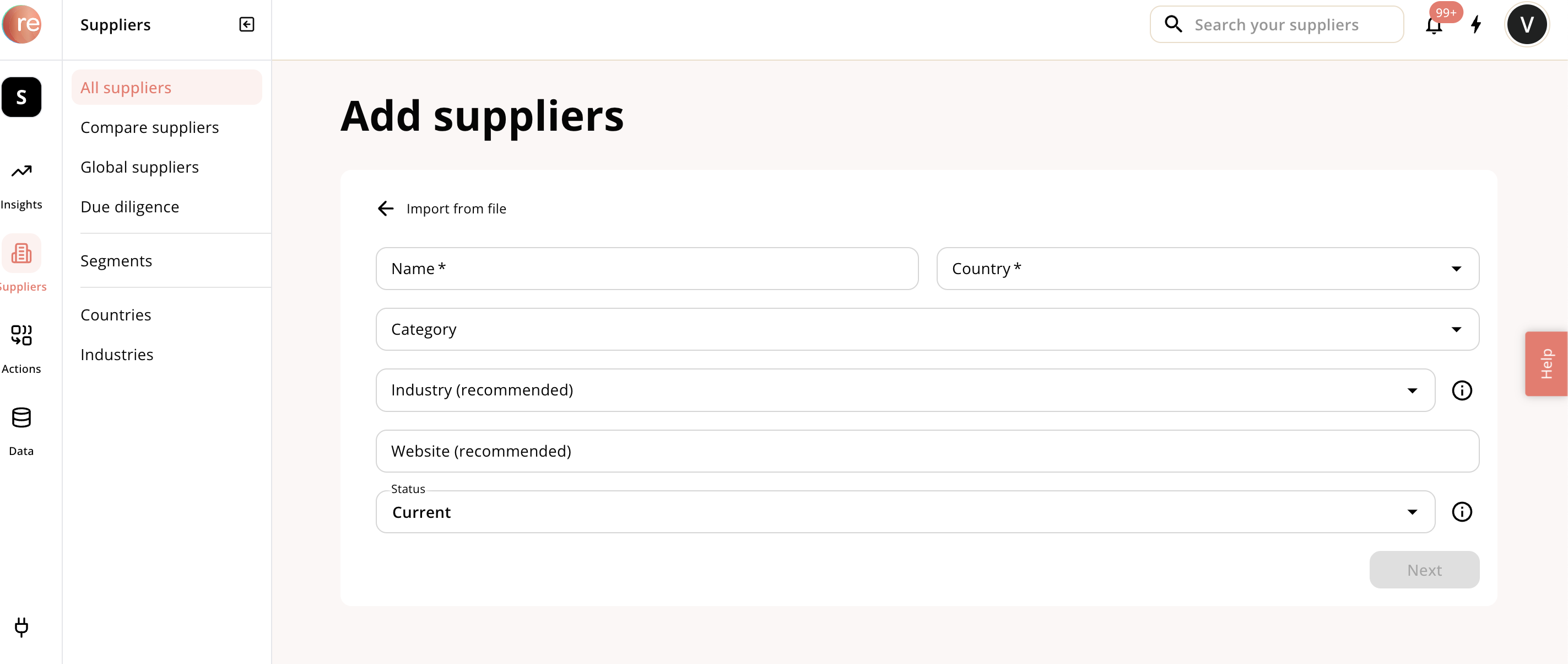 To add a supplier manually, click on Add suppliers > Add suppliers manually > add the name and country of the supplier. You only need the name and country of the supplier to add them manually. However, you should make sure that the rest of meta data is filled in earlier for easy processing later. To learn more visit the Supplier metadata section.