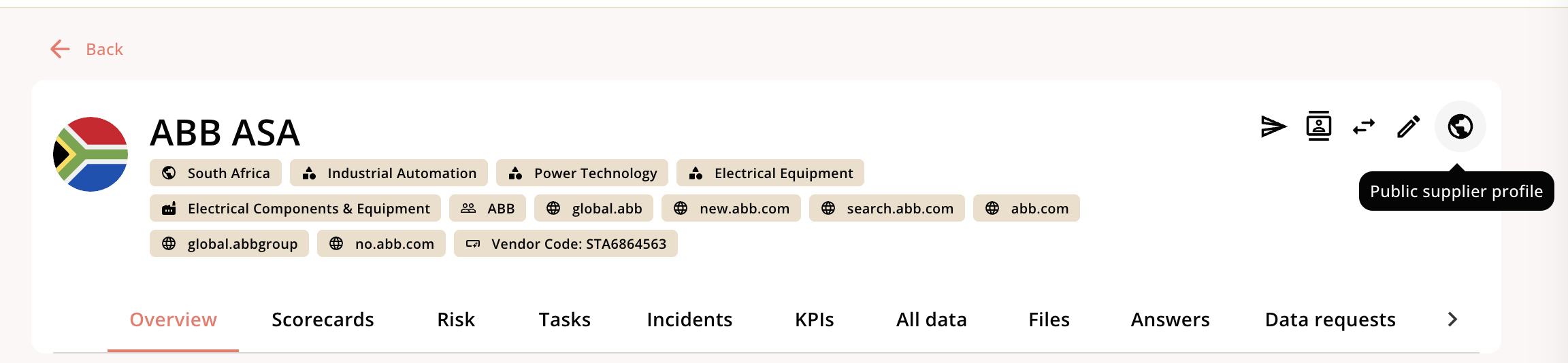 Public supplier profiles are basically sanitized versions of the supplier overview page. It excludes your notes, your internal categories, and any reference to your organization It has a unique link that’s publicly available without logging in, and a button to redirect to the specific supplier page pending login. This url can be shared in the API The intention is that it’s a URL that can be integrated with your ERP or procurement system, where your procurement people or other partners can get directed and see more information without logging in, while also easily access detailed information if they’re already logged in To view the public supplier profile, click the earth icon in the top right corner of your internal supplier profile Public profiles are an opt-in feature and needs to be enabled For more information on APIs go to API and integrations For more information on how to allow anyone with your email domain to create an account, go to Domain-based self-signup
