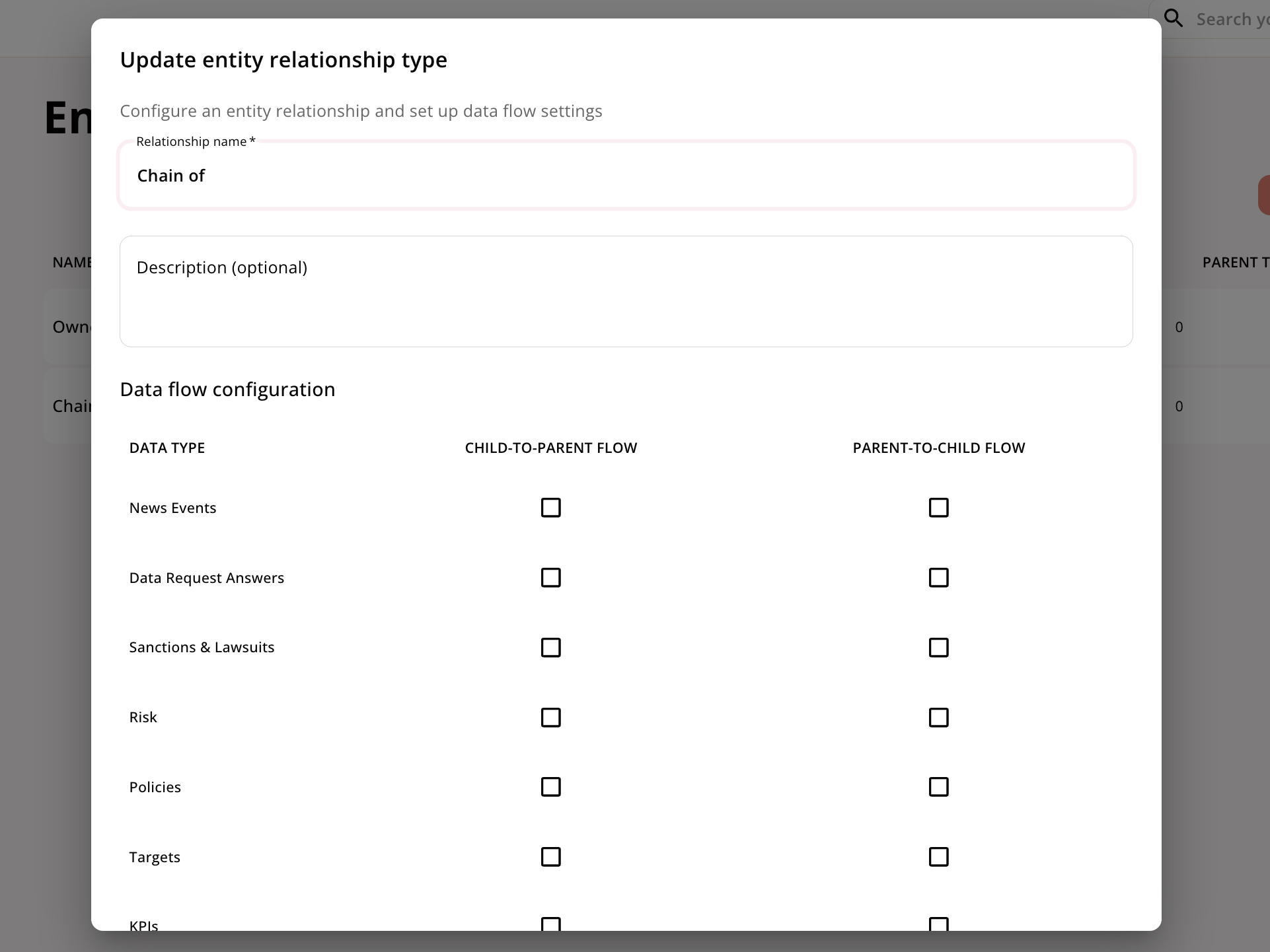 There can be different relationship between suppliers. E.g. in a subsidary relationship you may want the policies and emission reduction targets from the parent to be visible of the child, but you may not want the certifications on the child to be visible on the parent Therefore, you can define exactly how you want data to flow between two entities. Both what flows up (i.e. from the child to the parent) and what flows down (i.e. from the parent to the child). The following data types are possible to control:- News events