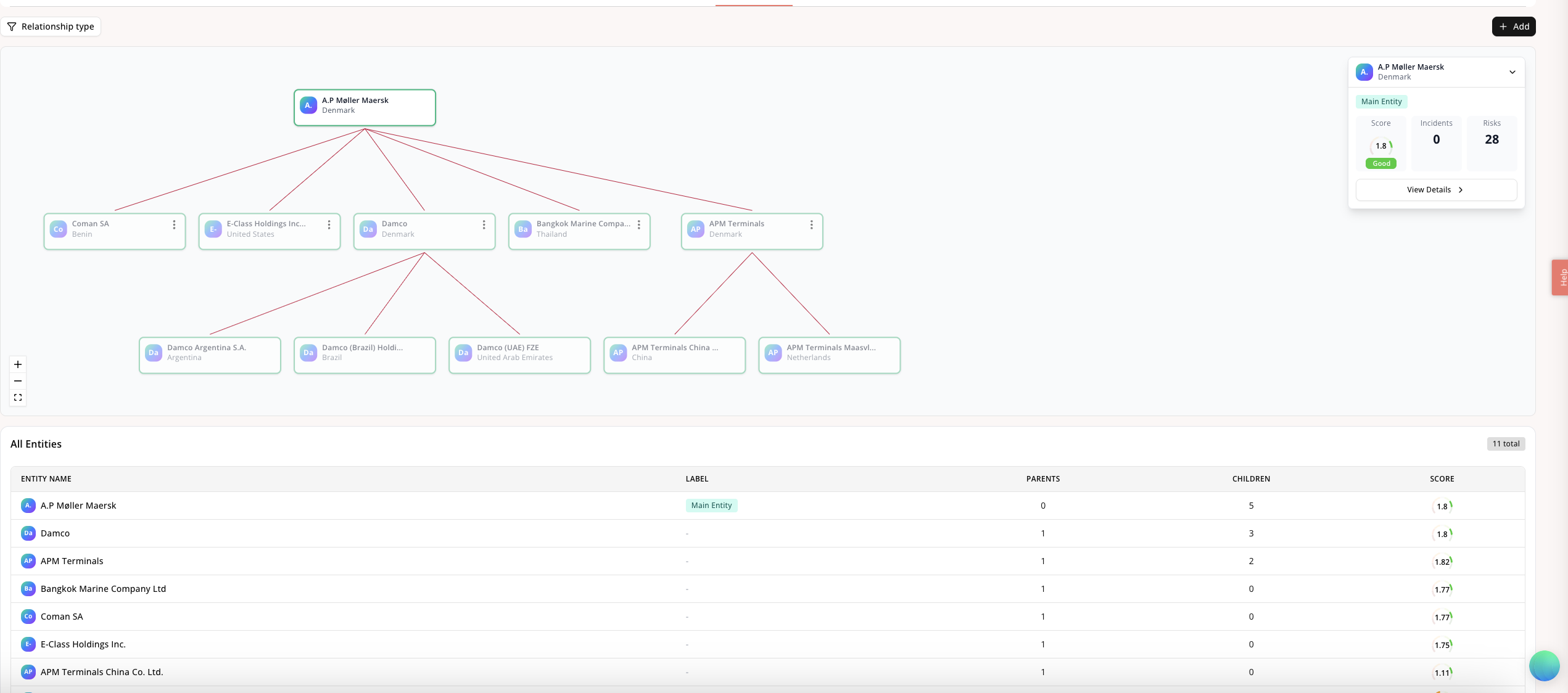 On the ‘relationships’ tab of a main supplier, you can visualize all that suppliers relationships. You can filter for different types in the top left corner, and at the bottom of the page you can see a helpful table of all the related suppliers together with that supplier’s overall score. You can also click into any of the suppliers in the visualization to see risk and incident counts, and of course navigate directly to that supplier for more info