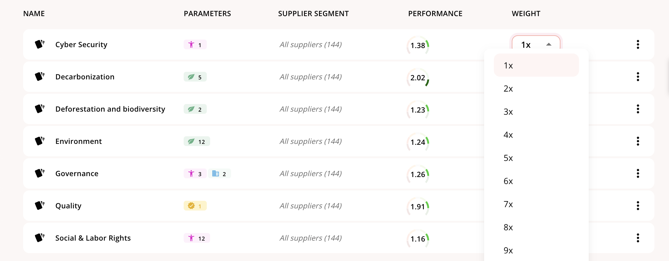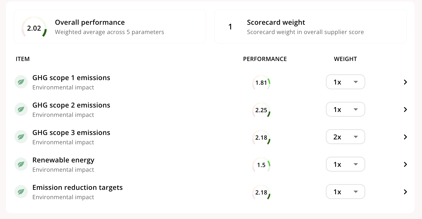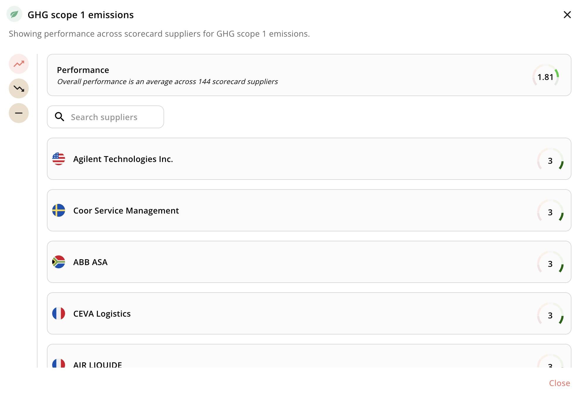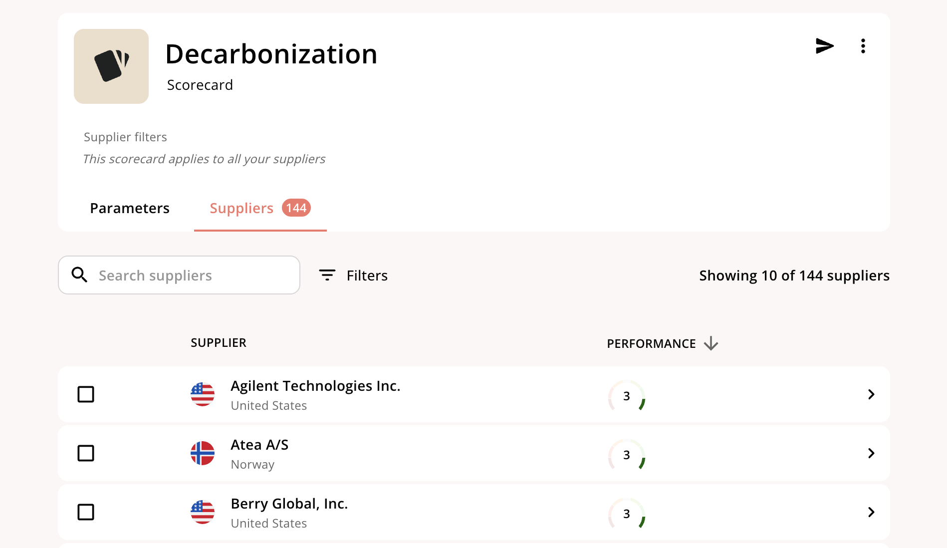 Once you’ve created a scorecard, there are a few ways to explore the effects of the scorecard On the scorecard itself, you can deep-dive into any of the parameters and see which suppliers have a positive score, negative score, or a score of zero, which indicates the topic is not material