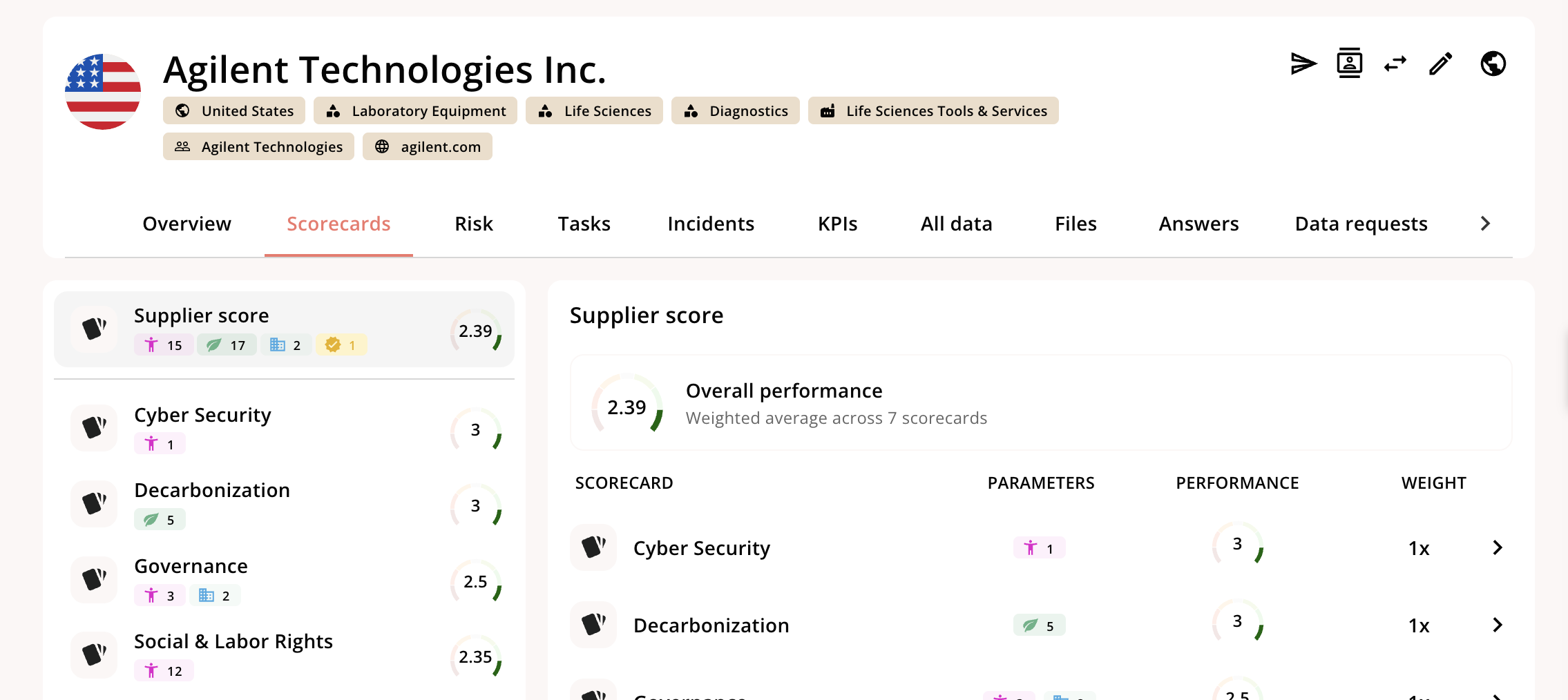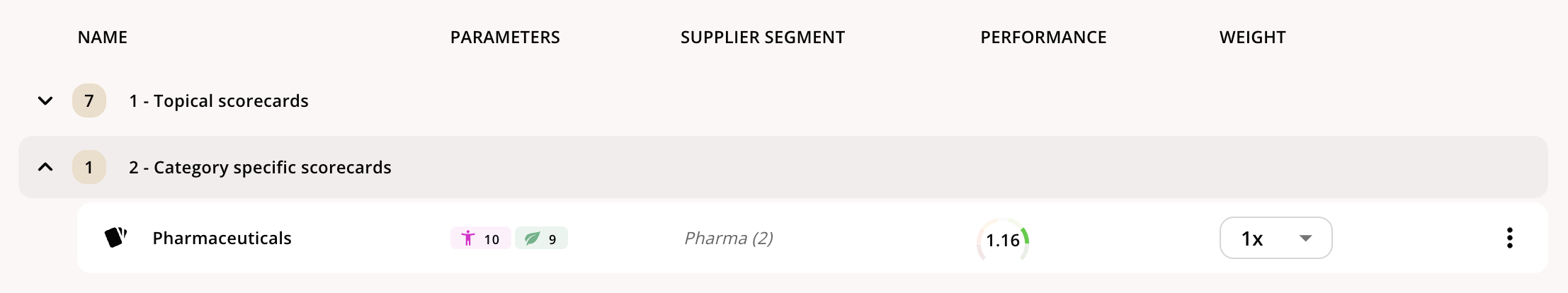 For a more complex set-up, we have a grouping feature to help you group scorecards. One configuration we see frequently is grouping scorecards by:- Topical scorecards that apply to all suppliers