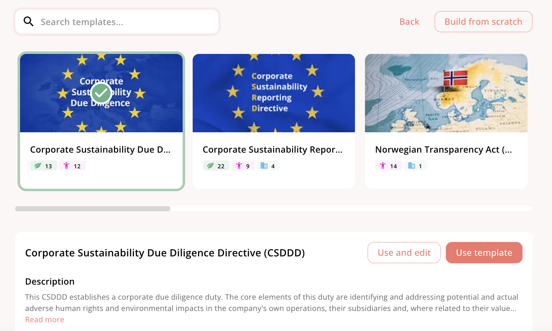 - Compliance tailored strategies: broad scorecards addressing all parameters required for a compliance legislation (e.g. CSDDD), and then using the scoring setting to only score suppliers when a parameter is ‘material’; read more here: Should a supplier get evaluated on an immaterial topic?