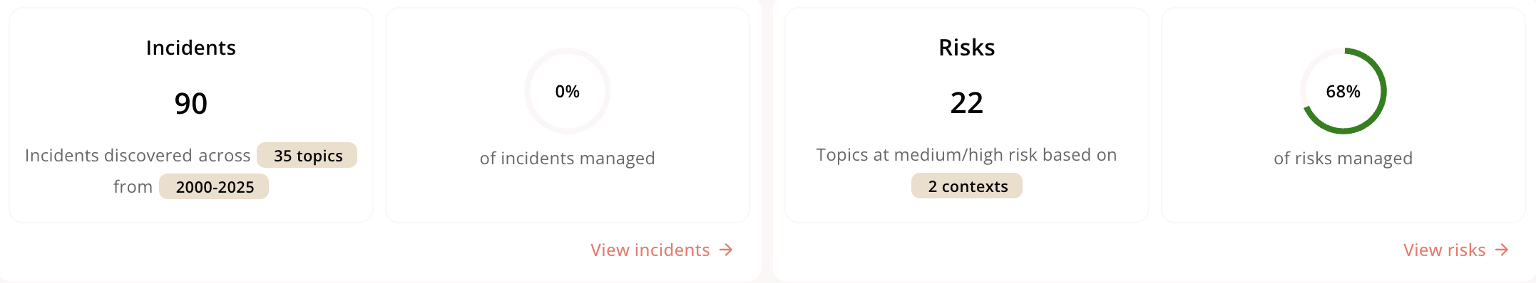 The incident and risk overview counts all the unique incidents and risks across the supplier For incidents it counts the number of topics/parameters the incidents are associated with, and the time frame of the incidents. It also shows how many of those risks have been managed For risks it counts the total number of medium/high risks observed across the number of contexts (a context can be an industry or location). It also counts how many of those risks are currently managed