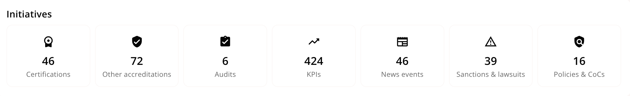 Initiatives gives an overview of all the different types of actions found on the supplier, and divides it into relevant buckets. If a supplier doesn’t take any positive action, or haven’t been associated in any incidents from sanctions or in adverse news, it will be counted as 0