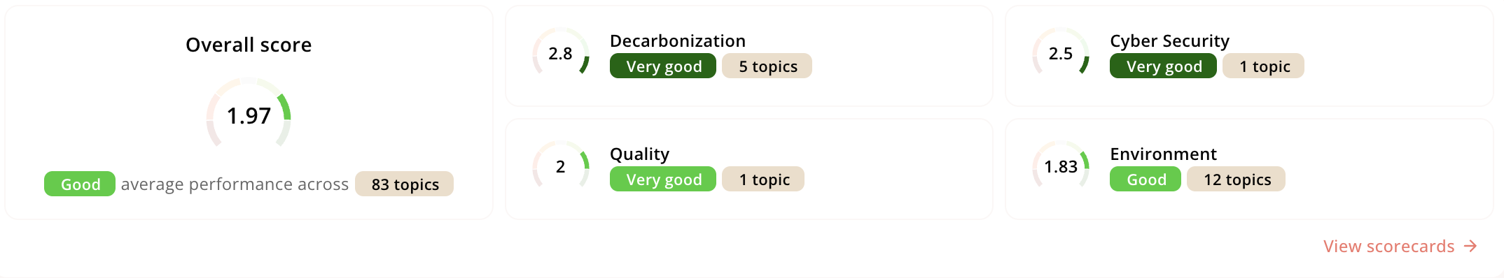 The score overview shows the overall score on this supplier and the first 4 scorecards you have on it It also simplified scoring by further adding textual labels to it, like ‘very good’ or ‘very poor’ performance