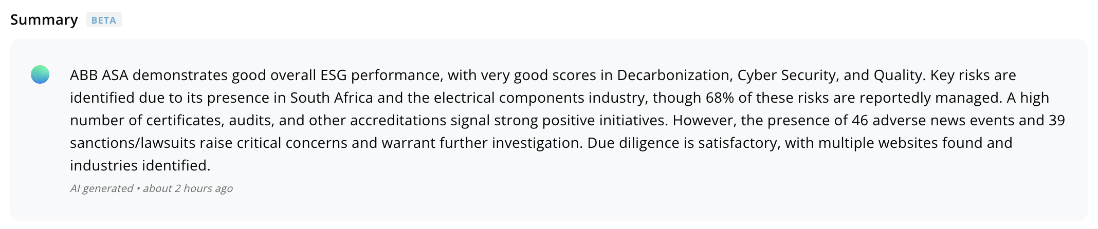The AI summary is auto-generated and auto-updated whenever you visit a supplier. That means it’s always fresh and up-to-date according to the latest data on that supplier, and at the same time, we don’t spend a lot of electricity (and emissions) on updating summaries no one reads The summary is made to provide a written summary of what you see on the overview page. It’s still in Beta, so let us know what’s more or less useful to include in this summary Below the summary, we include a space for internal notes, so you have have those 2 represented together. Read more in our Supplier notes